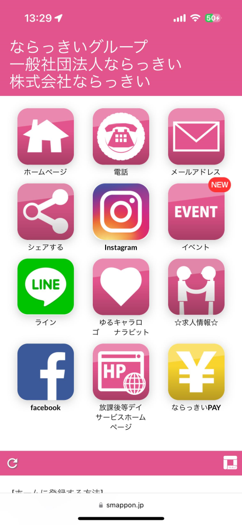 施設の子どもたちや、保護者との連絡用として活用しています。施設のでイベントの連絡や、保護者からの欠席の連絡などならっきいの情報をまとめたツールです。スマホのホーム画面にアプリのように置くことで、関係者はいつでも最新の情報にたどり着けます。