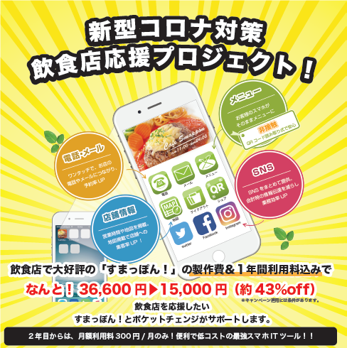 飲料メーカー協力の下、飲食店への応援プロジェクトとして、すまっぽん!中心としたデジタル化のお手伝いをさせていただきます。