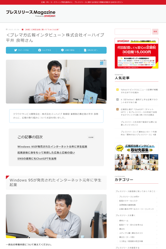 クラウドサービス開発会社・株式会社イーハイブ 取締役 業務執行責任者の平井 良明さんに、広報の取り組みについてお話を伺いました。