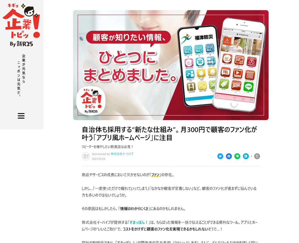 株式会社イーハイブが提供する「すまっぽん!」は、ちらばった情報を一括で伝えることができる便利なツール。アプリとホームページの“いいとこ取り”で、コストをかけずに顧客のファン化を実現できるかもしれないそうで…!