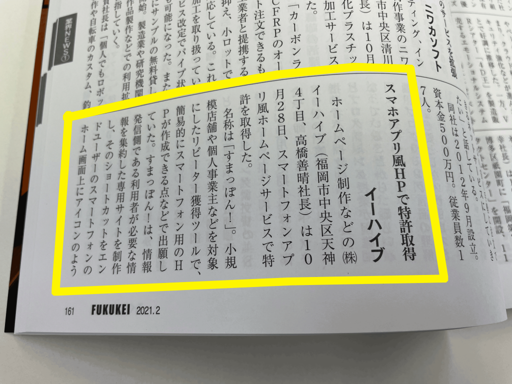 ホームページ制作などの株式会社イーハイブ(福岡市中央区天神4丁目、高橋善晴社長)は10月28日、スマートフォンアプリ風ホームページサービスで特許を取得した。