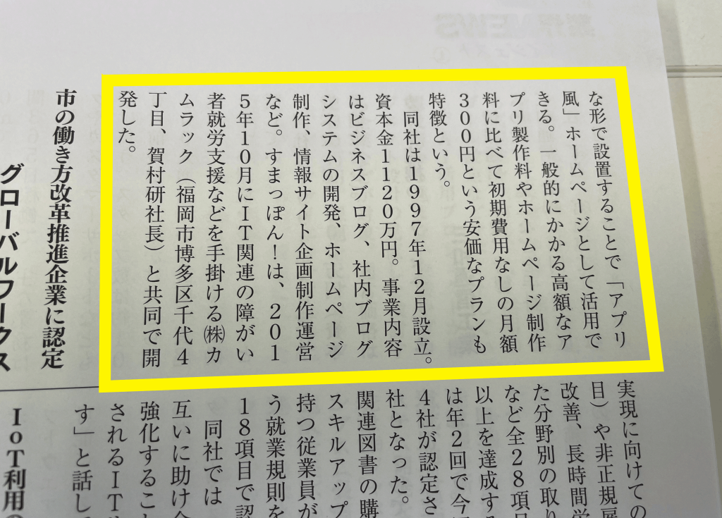 同社は1997年12月設立。資本金1120万円。事業内容はビジネスブログ、社内ブログシステムの開発、ホームページ制作、情報サイト企画制作運営など。すまっぽん!は、2015年10月にIT関連の障がい者就労支援などを手掛ける株式会社カムラック(福岡市博多区千代4丁目、賀村研社長)と共同で開発した。