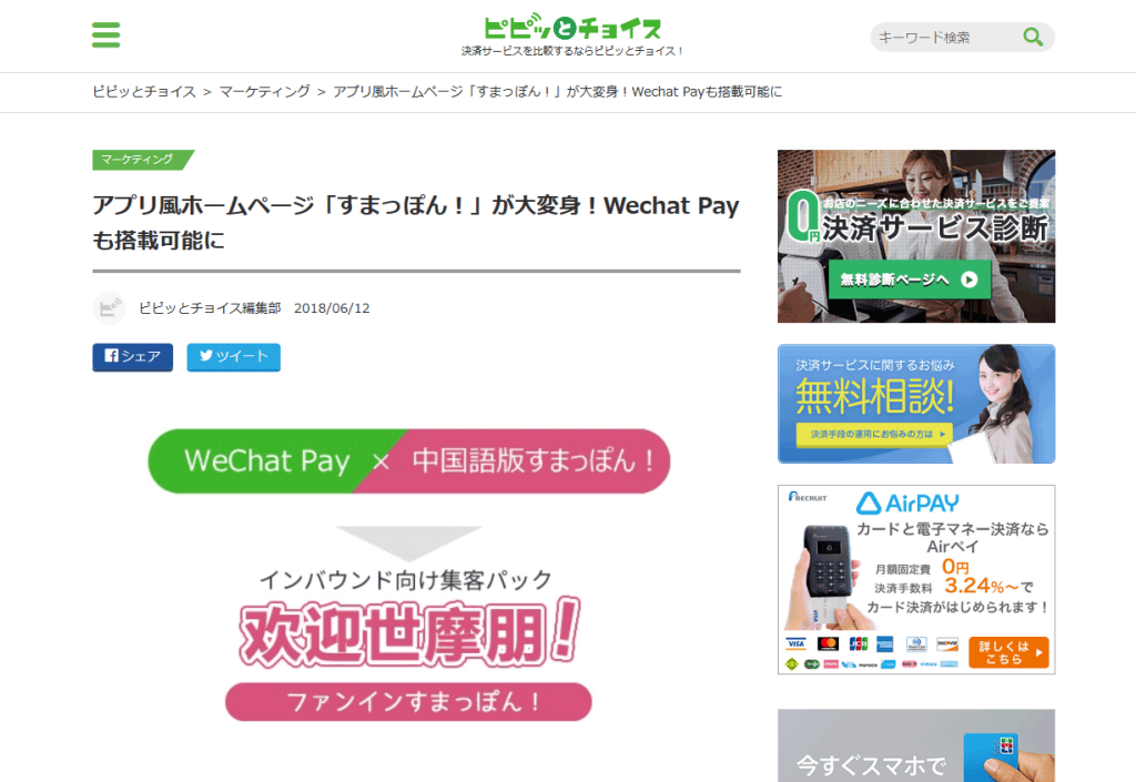 ピピッとチョイス > マーケティング > アプリ風ホームページ「すまっぽん!」が大変身!Wechat Payも搭載可能に