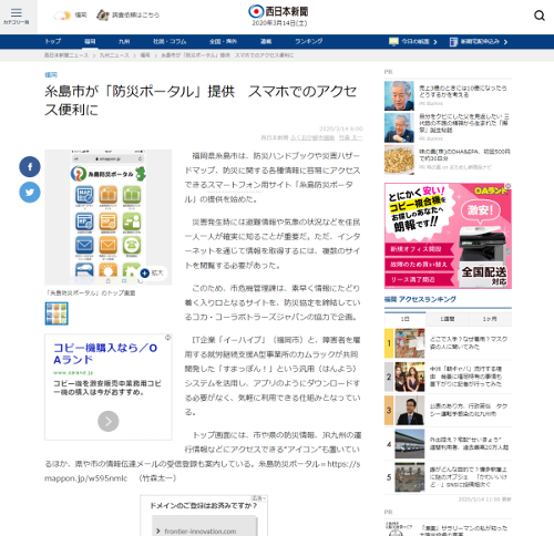 ~~~~ 記事抜粋 ~~~~~~~~~~~~~~~ 2020/3/14 西日本新聞 ふくおか都市圏版 「糸島市が「防災ポータル」提供 スマホでのアクセス便利に」 福岡県糸島市は、防災ハンドブックや災害ハザードマップ、防災に関する各種情報に容易にアクセスできるス...