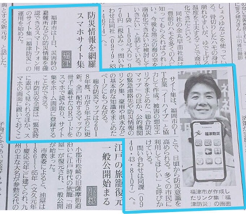 読売新聞 2019年4月2日朝刊 掲載 記事引用----------------------------------------------- 防災情報を網羅スマホサイト集 福津市は1日、災害時の避難所などの防災情報を確認できるスマートフォン用のサイト集「福津...