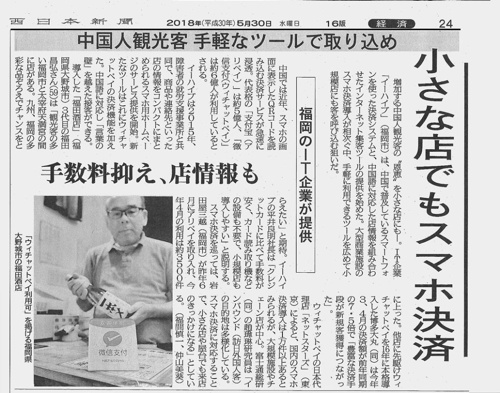 西日本新聞 2018年5月30日朝刊掲載 記事一部引用----------------------------------------------- 『小さな店でもスマホ決済』 -中国人観光客 手軽なツールで取り込め- 増加する中国人観光客の”恩恵”を小さ...