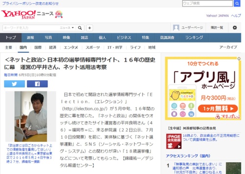Yahooトピックスにて下記記事が ピックアップされました。 ~~~~記事抜粋~~~~~~~~~~~~~~~~~~~ 日本初の選挙情報専門サイト、16年の歴史に幕 運営の平井さん、ネット活用法考察日本で初めて開設された選挙情報専門サイト「Election.(エ...