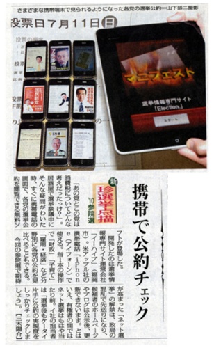毎日新聞 夕刊 2010.07.07 「iPhoneアプリ 選挙情報専門サイト」