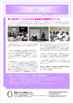第35号 2010年6月1日発行福岡ビジネス創造センターだより 第3回 九州ソーシャルビジネス(参加者社会貢献型)フォーラム 2010年5月29日(土)開催 写真中央で発表しているのが弊社平井です。 発行:福岡ビジネス創造センター