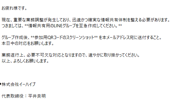 現在、当社名や代表者名を装った不審なメールが送信されているとの情報が寄せられております。